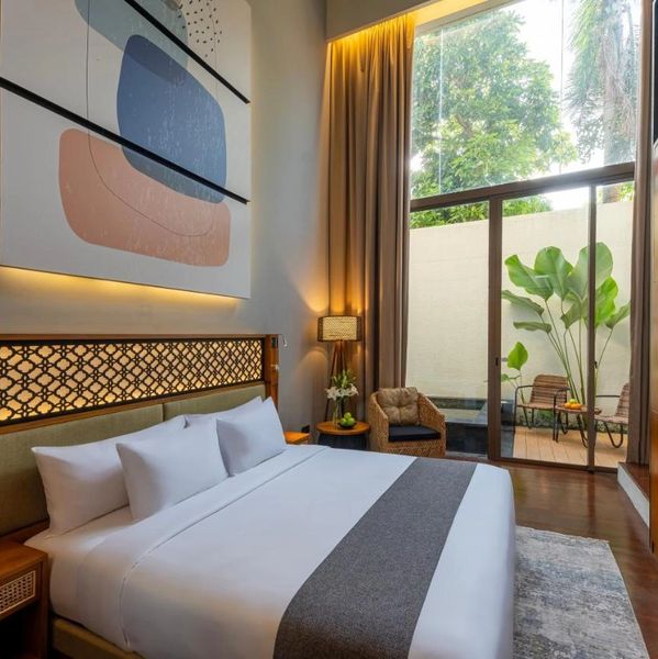 The Deluxe Room provides a restful environment to unwind after a busy day spent exploring the sights of Ubud. It is a cosy base featuring clean-line furnishings, a smart en-suite bathroom and a decorative wall that showcases Bali’s creative legacy. A private terrace or balcony blends seamlessly into the outdoors providing extra space to sit and relax.